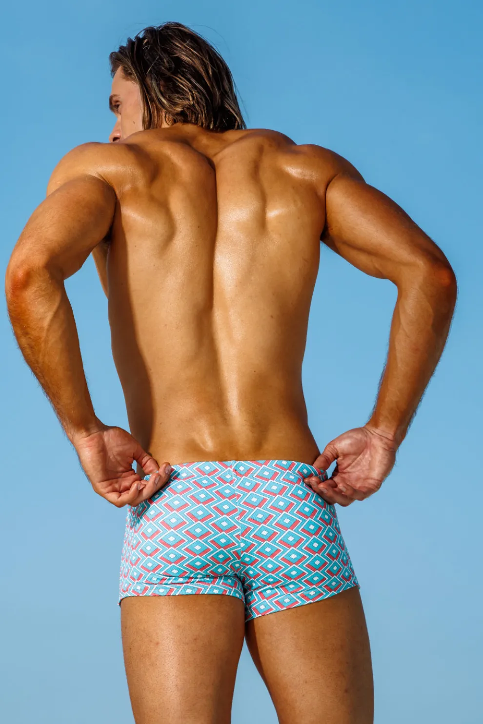 Geometric Aqua short with red stripes. Rubber Sauvage Log.. 3″ Inseam 8″ Length