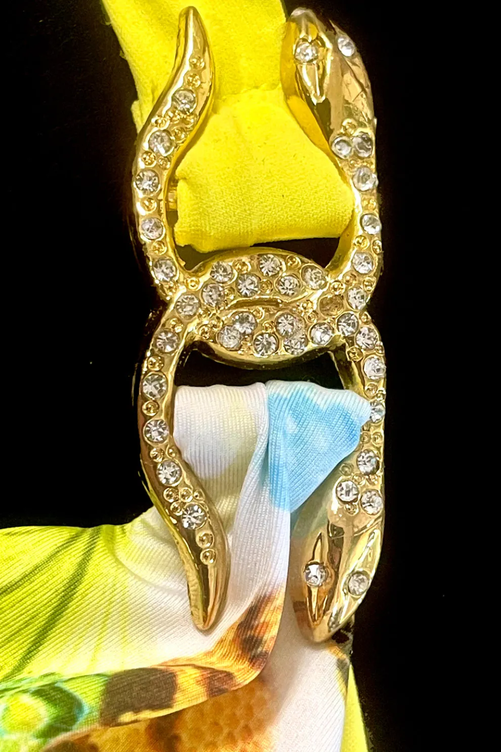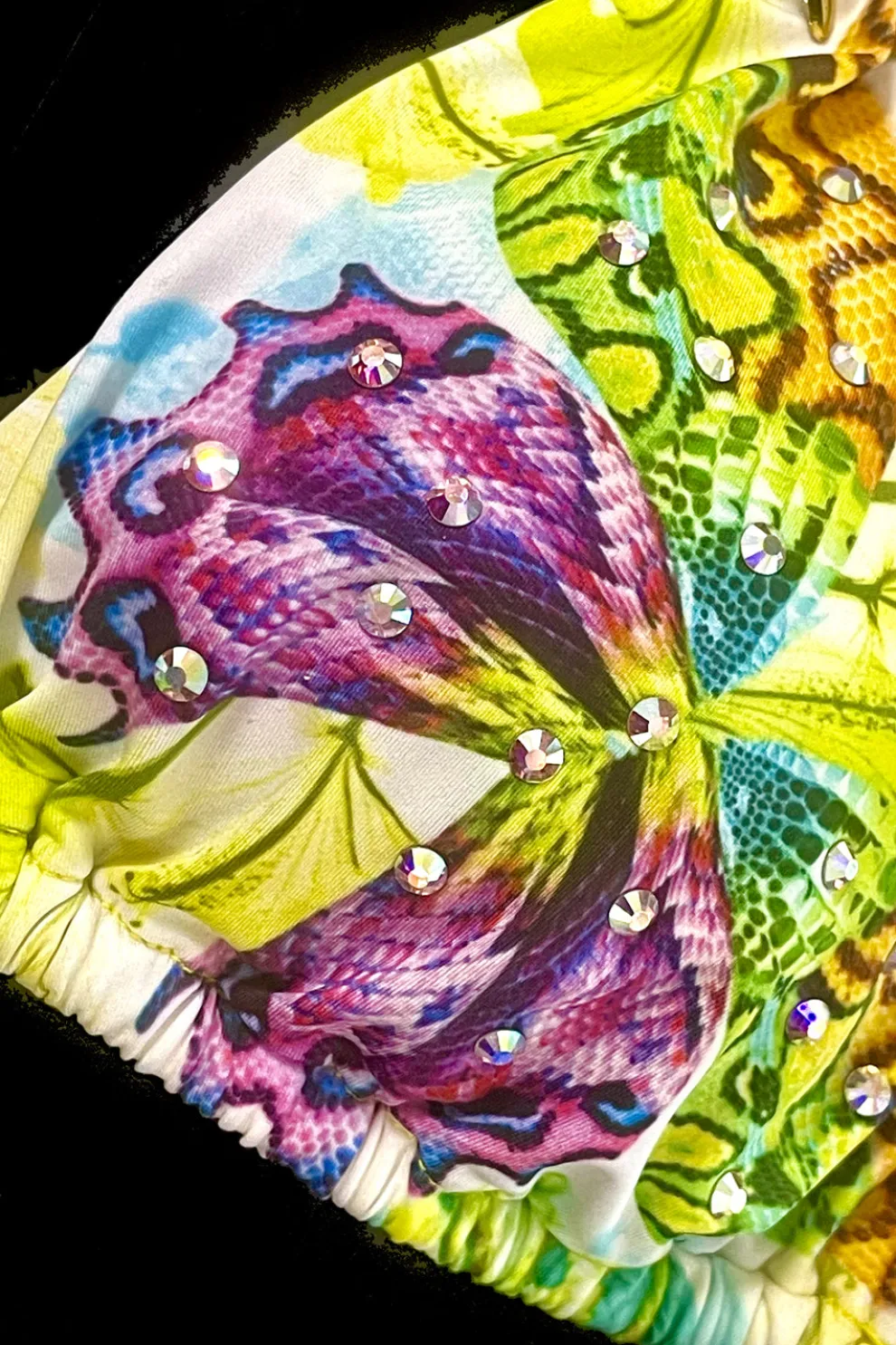 Romantic Butterfly print – Italian Nylon Lycra. Haltertop adorned with gold crystal snakes and optional hand placed Swarovski crystals.
