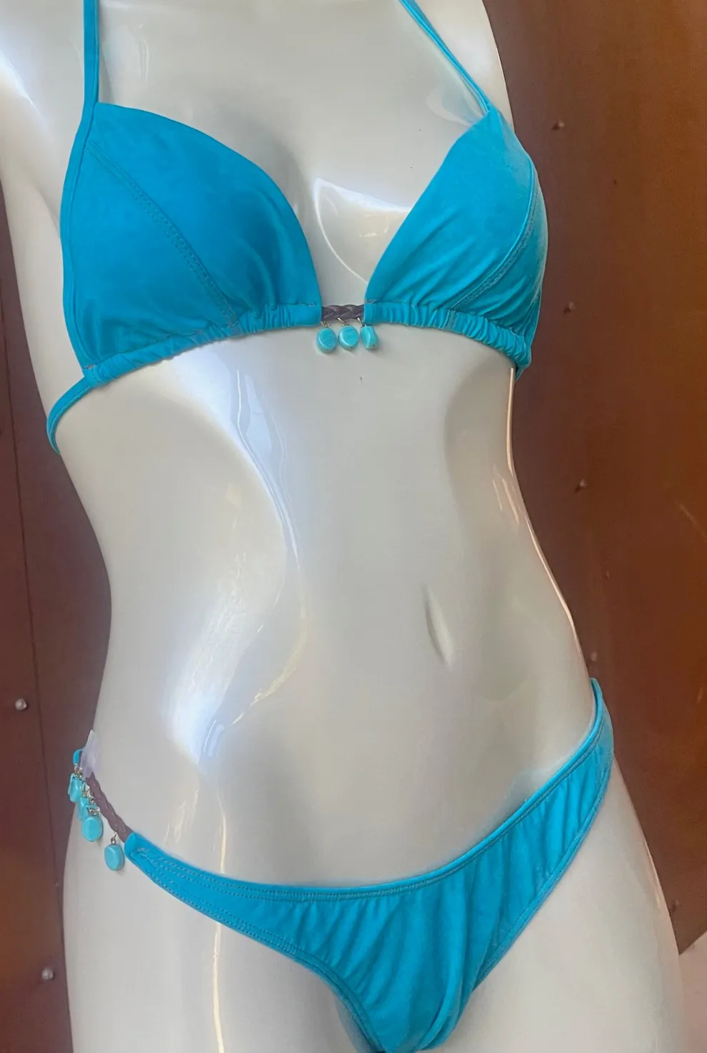 Triangle top with bead center. Scoop Bottom with beaded side trim. Brushed Nylon Lycra gives a suede effect.